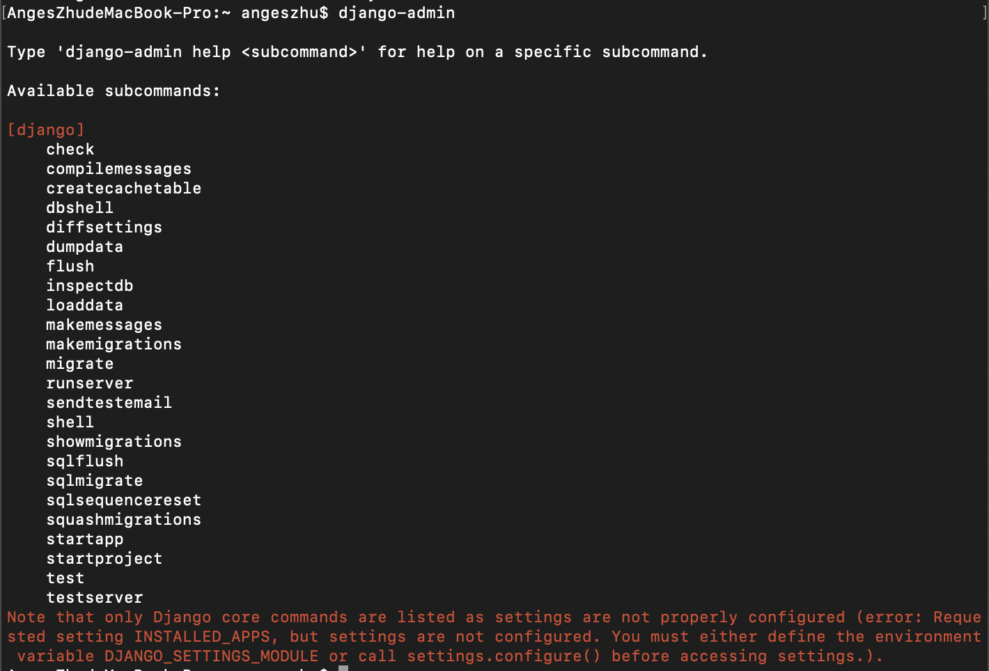 请注意仅列出了Django核心命令因为未正确配置设置错误请求的设置INSTALLED_APPS但未配置设置。您必须定义环境变量DJANGO_SETTINGS_MODULE或在访问设置之前调用settings.configure 这是因为我们直接在django-admin中运行并没有django项目所以他只给我们列了自带命令。