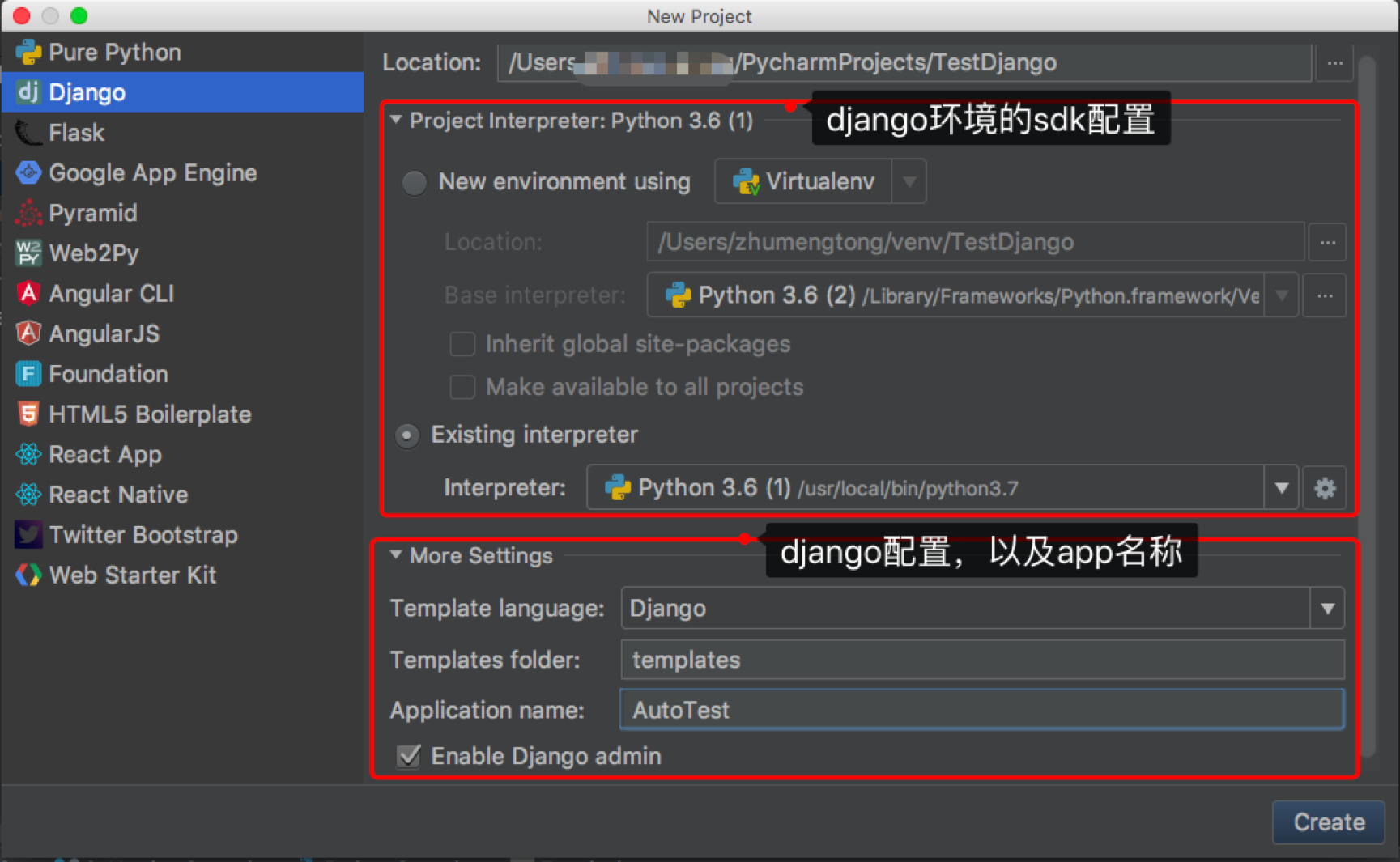 也可以在pycharm创建项目时,就一起创建好,pycharm给我们提供了这样的功能。