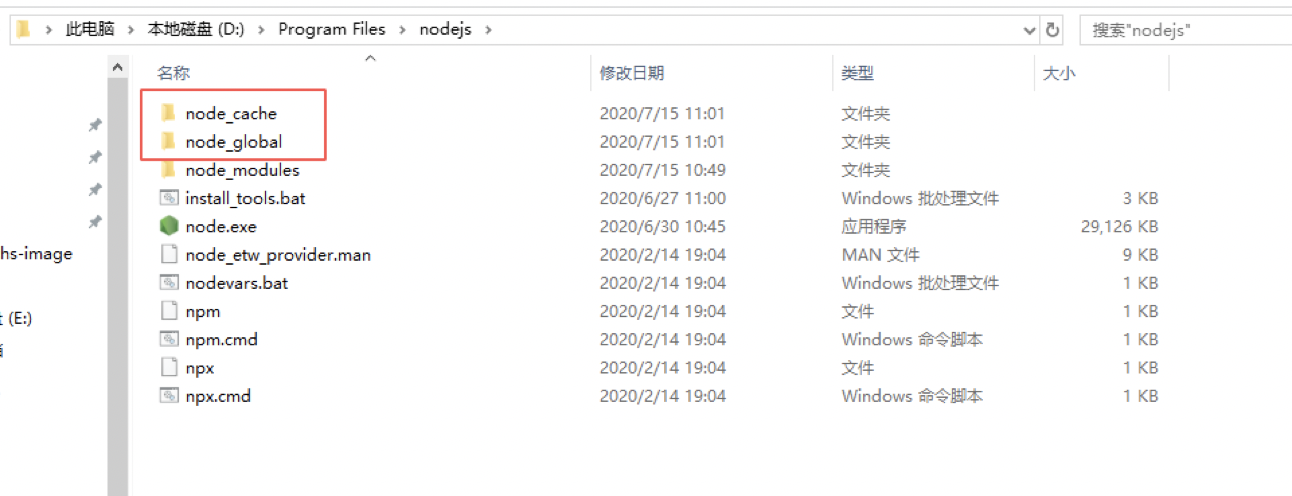 在nodejs安装路径下新建node_global和node_cache两个文件夹